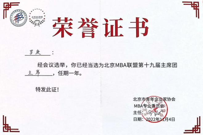On November 4, the 19th Beijing MBA Alliance General Conference was successfully held at the headquarters of Goldwind Technology Co., LTD. The conference was hosted by the MBA Alliance special committee of the Beijing Young Entrepreneurs Association. The leaders of the Beijing Young Entrepreneurs Association, the leaders of the MBA Alliance special committee, and the presidents of more than 30 universities MBA Association of Beijing Alliance participated in the conference. Luo Geng, a graduate student of Business administration in Business School, was elected as the president of the 19th Beijing MBA Alliance by unanimous vote in the election on the spot.