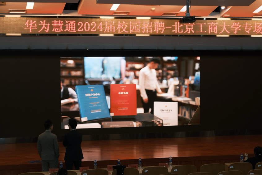 On the evening of November 9, the Huawei Huitong 2024 Campus Job Fair featured a special lecture at Beijing Technology and Business University, held in the B News Hall of the Academic Exchange Center on Liangxiang Campus. The theme of this campus recruitment lecture was "Big Dream is Right," organized by Business School. Attendees included Zhang Qian, Deputy Secretary of the Party Committee of Business School; Yang Nankun, Head of the Experience Store Department at Huawei Terminal's Beijing Representative Office; Wang Jiaolong, Human Resources Director at Huawei Terminal's Beijing Representative Office; Zhao Xianwen, Head of Huawei Terminal’s in01 Direct Flagship Store; Wang Ganrui, Recruitment Manager for Marketing and Sales Service Management Department at Huawei Terminal; Ning Danfeng, Recruitment Manager at Huawei Terminal's Beijing Representative Office; as well as Cheng Yu and Wang Luyang from Business School counseling team.