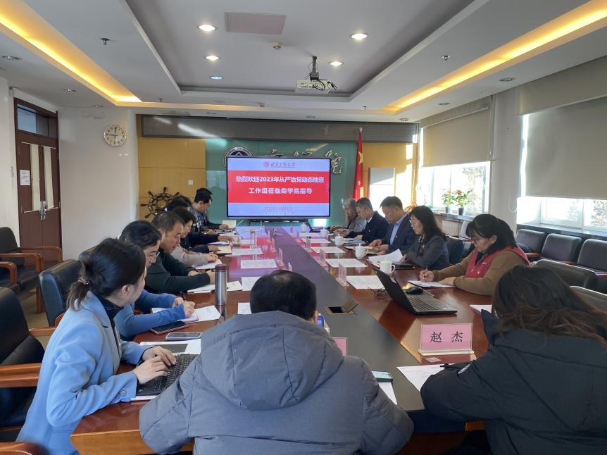 In line with the 2023 implementation plan for assessing comprehensive strict Party governance (Party building) and political ecological analysis set by the CPC Beijing Technology and Business University Committee, Zuo Min, a member of the Standing Committee of the University Party Committee and Vice President, led the fifth working group on December 21 to conduct dynamic spot checks at Business School regarding comprehensive strict governance of the Party while reviewing their work report. The meeting included participation from all members of business school's leadership team—party branch secretaries, professor representatives, young and middle-aged teacher representatives, counselors, and full-time organizational staff—and was presided over by Gao Lihua, Director of Personnel Department and Minister for Teachers' Work within the Party Committee.