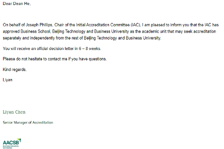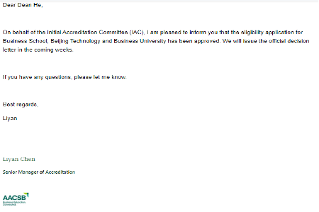 On November 8, 2024, The Association to Advance Collegiate Schools of Business (AACSB) Accreditation Committee sent us a formal notice Confirm that the Business Unit of Accreditation Application (UA) and Eligibility Application (EA) of our Business School have successfully passed the examination. This marks that the preliminary work of AACSB accerditation of our hospital has been completed in advance and officially entered the interactive stage of accerditation.