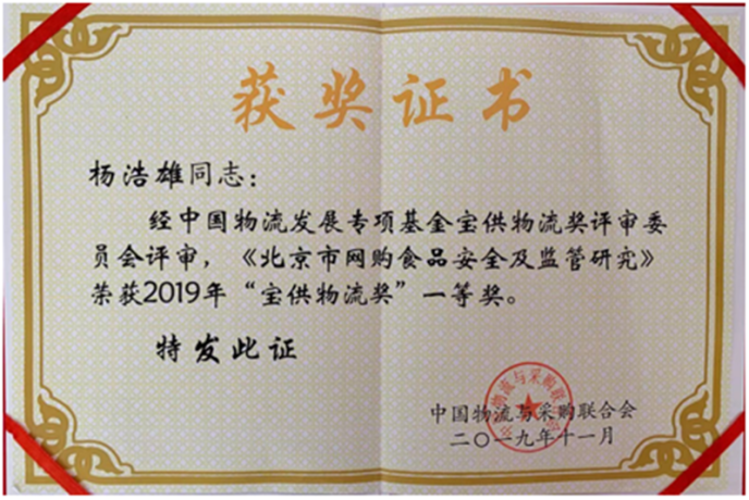 China Federation of Logistics & Purchasing held the “2019 (17th) China Logistics Entrepreneurs’ Annual Conference” in Kunming, Yunnan Province from November 23 to 24, 2019. In order to further promote the development of the logistics industry and accelerate the realisation of the construction goal of “Logistics Power”. The annual meeting awarded the industry leaders and related enterprises who made outstanding contributions to the logistics industry in 2019. Business School Professor Yang Haoxiong’s won first prize in the “2019 P&G Logistics Award” for his class on Food Safety and Regulation of Online Shopping in Beijing.