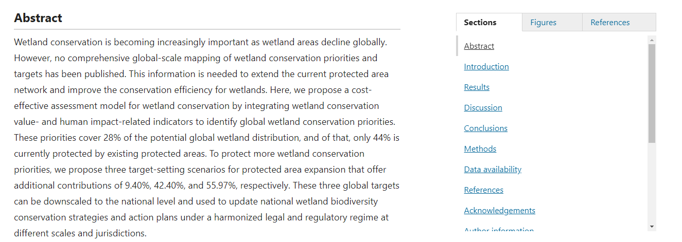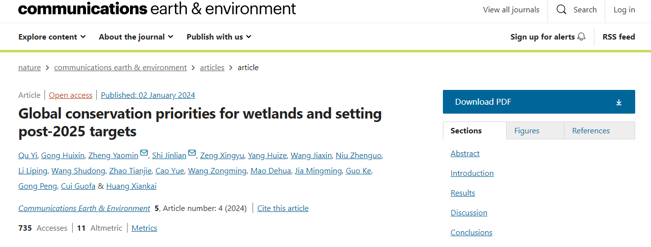 On January 3, 2024, a research team led by Associate Professor Zheng Yaomin from our institution published an academic paper titled "Global conservation priorities for wetlands and setting post-2025 targets" in the journal Communications Earth & Environment, a Nature-affiliated publication. The paper presents a cost-effective wetland conservation assessment model that integrates indicators of wetland conservation value and human impact to identify key areas for global wetland protection. It also proposes target-setting schemes based on the degree of protection. This research provides a new academic perspective for the conservation, restoration, and sustainable use of global wetlands, which is significant for maintaining ecological balance and human well-being.