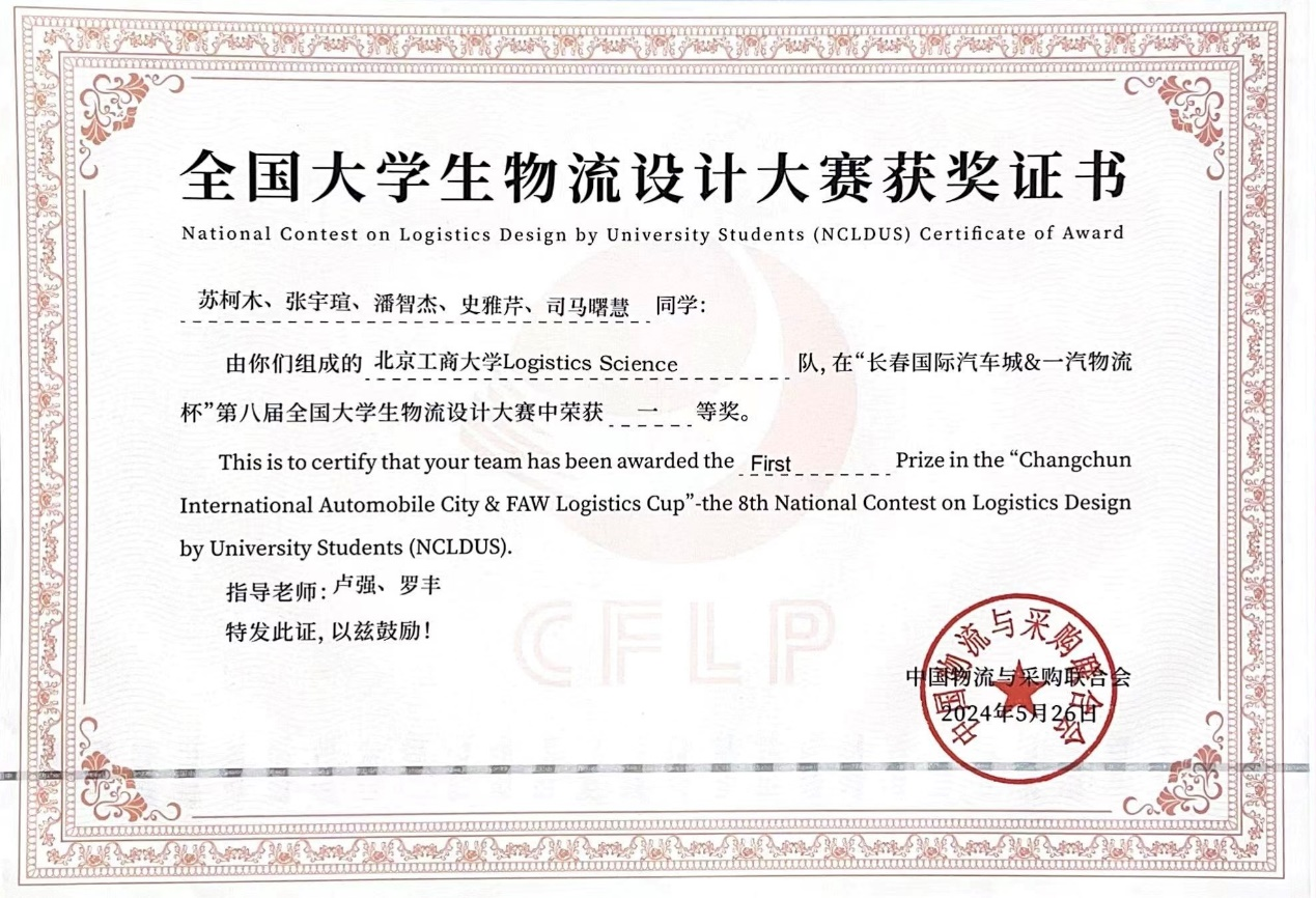 From May 23 to 26, the finals of the 8th National College Student Logistics Design Competition, sponsored by "Changchun International Automotive City & FAW Logistics Cup," were held in Changchun, Jilin. Our university's Logistics Science team won the First Prize in the competition. Additionally, our university is the only Beijing municipal university to receive a First Prize award.