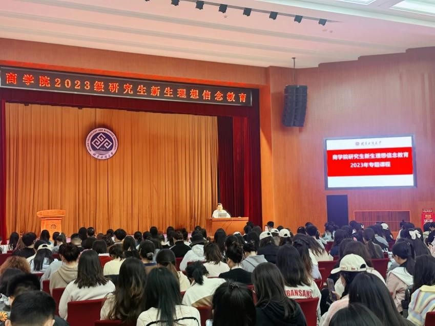 To enhance ideological and political guidance for young individuals and encourage their adherence to the Party's principles, on October 30, Business School held a thematic educational session on ideals and beliefs for the incoming class of 2023 graduate students, in line with admission education requirements. Fu Shilun, Secretary of the Party Committee at business school, Zhang Qian, Deputy Secretary, along with new graduate students from 2023 participated in this initiative. Graduate counselor Pan Meng presided over the meeting.