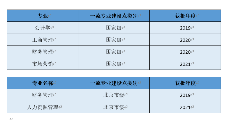 When the Ministry of Education launched the "Double Ten Thousand Plan" for the construction of first-class undergraduate majors in 2019, five undergraduate majors of our school—accounting, business administration, financial management, marketing, and human resource management—were successively approved as first-class undergraduate major construction sites. Accounting, business administration, financial management, and marketing majors were approved as national first-class undergraduate major construction sites in 2019, 2020, and 2021 respectively; financial management, and human resource management were approved as Beijing first-class undergraduate major construction sites in 2019 and 2021. Among them, accounting major was also selected as a key construction of first-class major in Beijing.