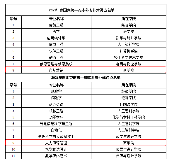 Recently, the General Office of the Ministry of Education issued the "Notice on Announcing the List of National and Provincial First-Class Undergraduate Major Construction Sites in 2021" (Education High Office Letter [2022] No. 14). The marketing major of our school was approved as the 2021 national first-class undergraduate major construction site, and human resources management major was approved as the 2021 Beijing first-class undergraduate major construction site. Since then, all undergraduate majors in the Business School have been approved as first-class undergraduate construction sites, achieving full coverage.