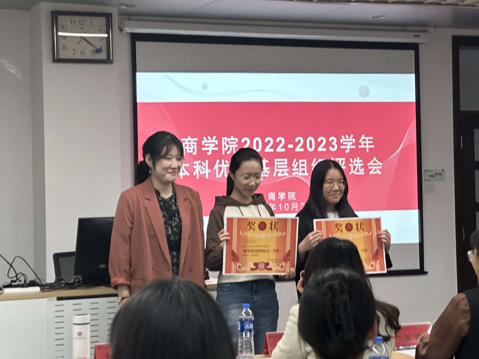 After the evaluation, the classes and dormitories that won the excellent grass-roots organization were awarded and took a group photo.