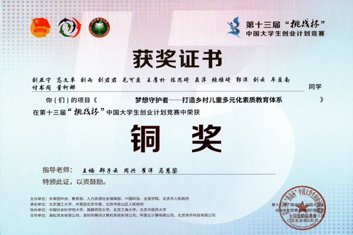 After a series of selections, the project "Dream Guardians—Building a Diversified Quality Education System for Rural Children" from the Business School has won one national bronze award in the "Challenge Cup" competition, marking the first time the School has achieved a national prize in the "Challenge Cup" national competition! The project team members include Liu Yaning (Master's in Accounting, Class of 2020), Liu Yu (Master's in Accounting, Class of 2020), Liu Junjun (Master's in Accounting, Class of 2020), and the guiding teacher is Professor Wang Nan, the Vice Dean of the Business School.