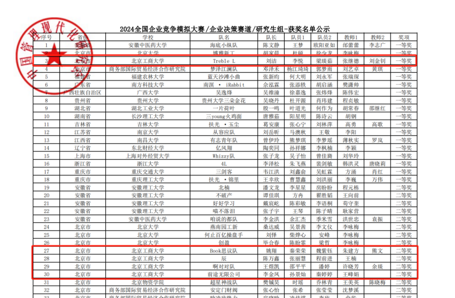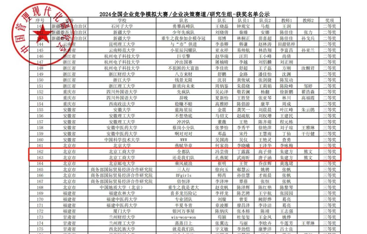“Promote Learning and Improve Quality with Competition”. In order to stimulate the innovative spirit and entrepreneurial consciousness of the students of the School of Business, the Center for New Business Youth Creation of the School of Business of the Beijing Institute of Technology and Business University played a key role in organizing and managing the National Enterprise Competition Simulation Competition. From pre-competition mobilization, resource allocation to schedule arrangement, it ensured the smooth progress of the competition. Meanwhile, a team of professional teachers, Liu Jinzhao and Zhang Jide, provided in-depth training and strategy guidance to the contestants, organized simulation exercises, and helped the contestants familiarize themselves with the competition process and enhance their decision-making ability. With the full cooperation of the Youth Innovation Center and the competition instructors, our college finally achieved excellent results in the fierce competition.