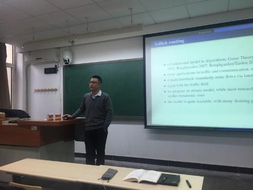On December 14, at the invitation of the Department of Logistics Management, Professor Cao Zhigang from Beijing Jiaotong University came to the Business School for an academic exchange. His lecture was held at Room 102 of the First Classroom Building at Fucheng Road Campus. Hosted by Miss Sun Hongxia, teachers and students from related disciplines of the Business School and the Economics School attended the lecture. The lecture was entitled "A Network Game of Dynamic Traffic".