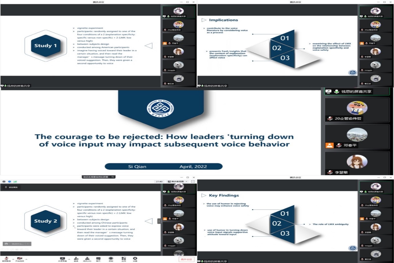 Concentrated on the research background, research approaches and research contents, Dr. Qian Si, illustrated her two academic findings in detail, namely, psychological mechanism of action when employees’ voice is rejected from the perspective of leaders and its impacts on employees’ subsequent voicebehaviors.