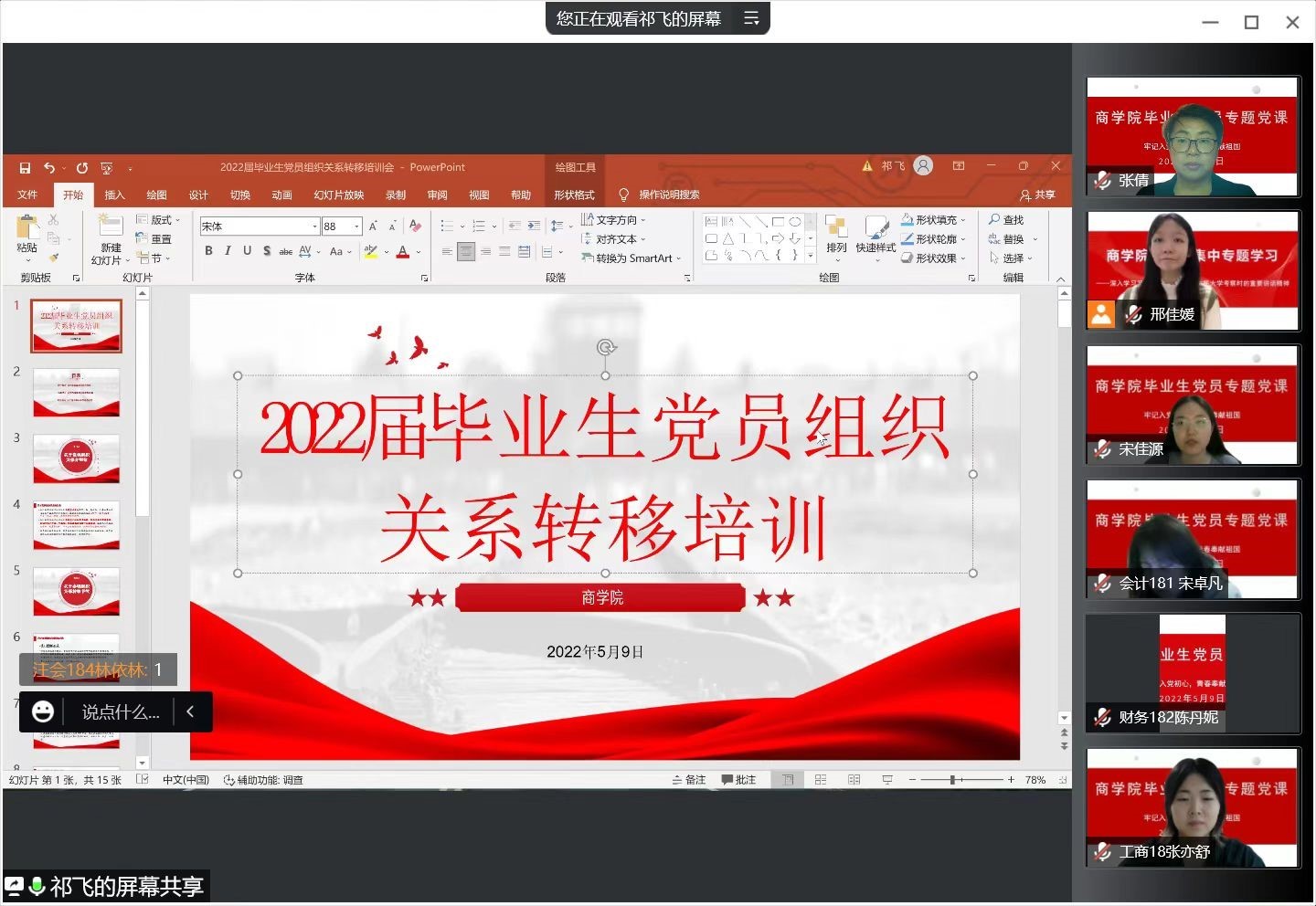 为加强对毕业生党员离校前的教育,进一步引导毕业生党员在择业就业观念、思想价值引领、爱校荣校意识、岗位职业廉洁等方面发挥先锋模范和率先垂范的作用,形成以学生党支部为核心、团支部和班级为支撑的思想政治教育工作格局,5月9日,台湾女优 面向2022届毕业生党员举办专题党课。台湾女优 党委副书记张倩、组织员祁飞、辅导员邢佳媛、冯可馨及152名毕业生党员参加会议,会议由辅导员邢佳媛主持。
