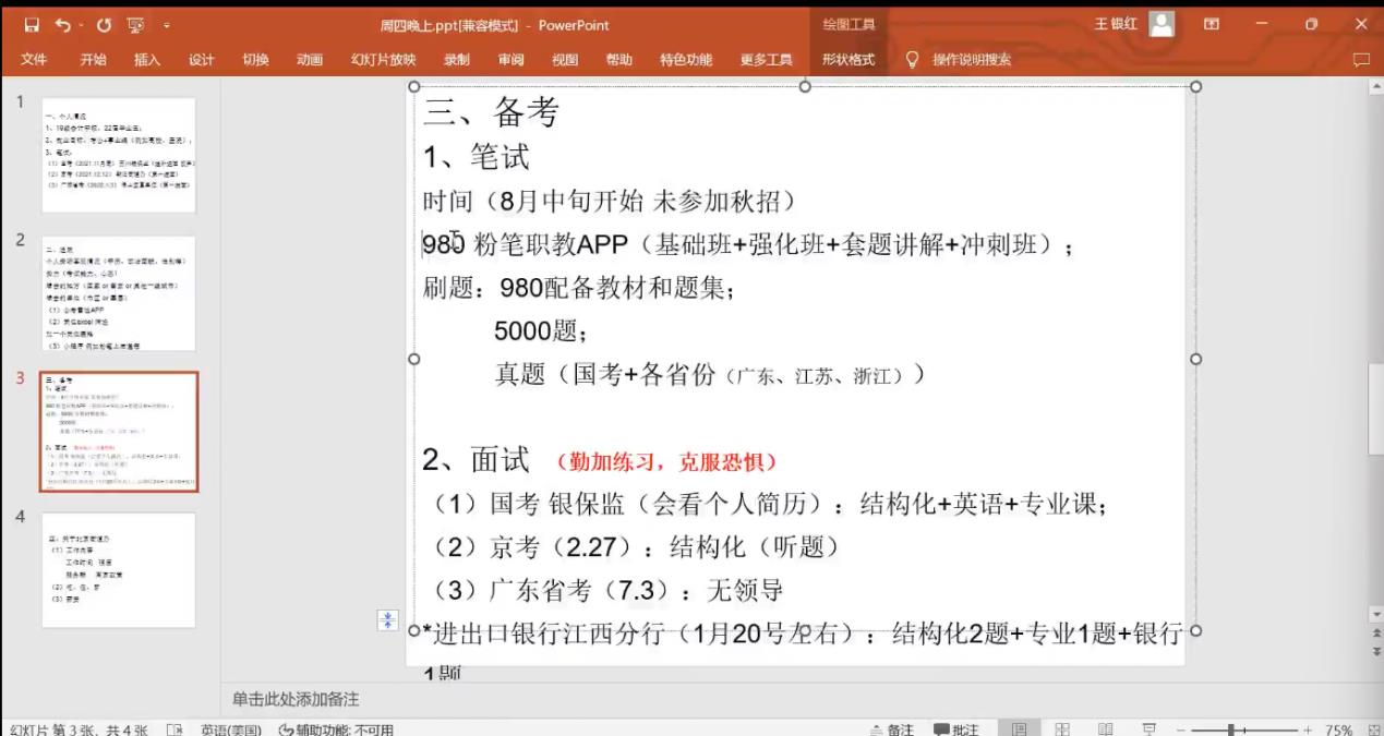 第二位发言的是王银红同学,22届会计学研究生,现入职北京市朝阳区政府首都机场街道办事处。王银红同学入学就立下了考公的目标,去年一年不辞艰苦,北京、广州大江南北奔走,参加了三次公考,她的观点是,结合自己的愿望以及自身条件选择合适的地域,她介绍了自己觉得好用的备考app和参加培训的经验,还给出了详细地如何结合自身的优势去选岗的筛选方法,诸多备考经验都是新鲜经历讲起来如在眼前。