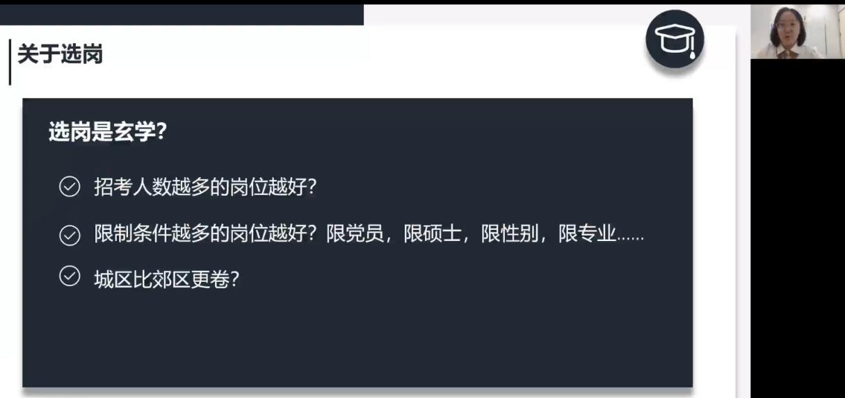 第一位分享的是张子薇同学,台湾女优 22届会计学研究生,现入职国税总局北京市税务局东城分局。张子薇同时参加了京考和国考,国考笔试排名并不靠前,但在面试中成功反超。她调侃道选岗是一门玄学,并非报录比越高的岗位、限制条件越多的岗位就越好,也并非城区就比郊区更卷,以逆向思维去选岗说不定会有意外的收获。更重要的是选岗意味着选择了自己未来的生活,所以遵从自己的愿望是很重要的。