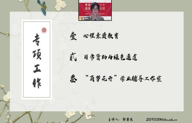 22级辅导员郭馨远老师从心理素质教育、日常资助与绿色通道、“商梦花开”学业辅导等三方面开展讲解,指导同学们要正确处理和对待心理问题,引导学优生在学有余力时要积极开展帮扶助人,详细解答了新生对于大台湾女优 园日常生活中的一系列问题。