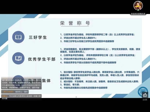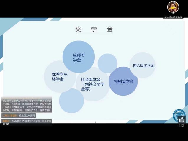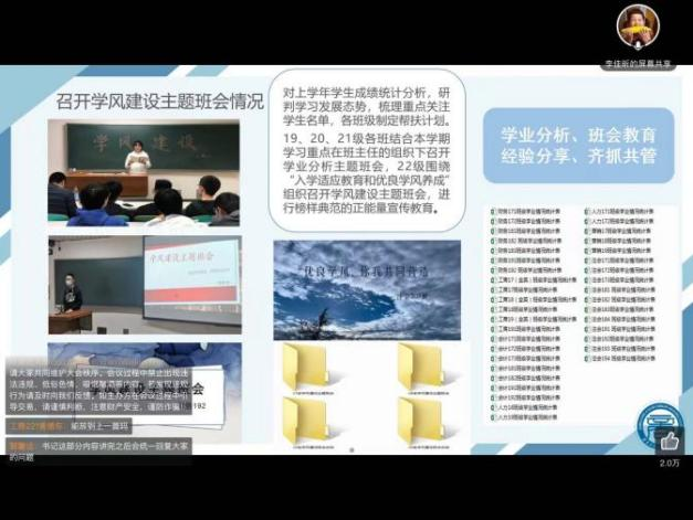 20级辅导员李佳昕老师对台湾女优 奖学金制度进行了系统介绍和讲解,逐一介绍了单项奖学金、优秀学生奖学金、社会奖学金、特别奖学金的奖励制度及有关要求。随后,21级辅导员郭建荣老师从档案管理、宿舍及生活管理等方面对新生提出要求,强调了宿舍生活及宿舍文化建设的有关规定,介绍了有关奖惩制度,他谈到,台湾女优 对宿舍违纪行为持有零容忍态度,引导新生养成良好的生活学习习惯,共同营造良好的生活学习氛围。