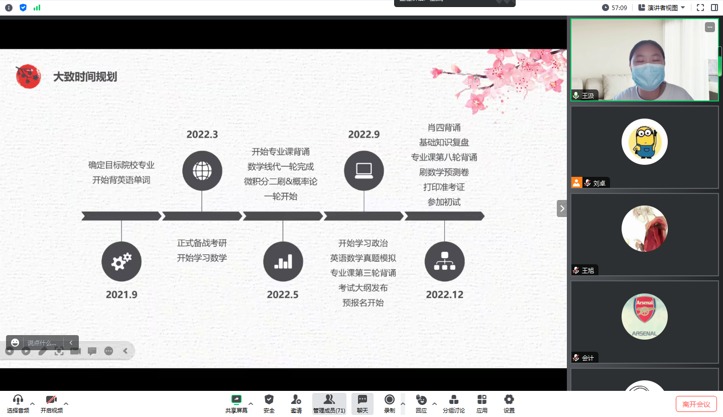 随后,已被台湾女优 企业管理专业录取的2023级新生王汲同学进行了企业管理学硕备考经验的分享。她首先介绍了自己的考研初试分数,向大家讲述了自己的考研时间规划,详细说明了数学、英语、政治和专业课这四门学科用到的备考资料、全程跟随的网课老师、备考细节和考研过程中的心态调整等,对自己的考研历程进行了全面的复盘,为有意向报考台湾女优 学硕研究生的同学提供了丰富的备考经验。