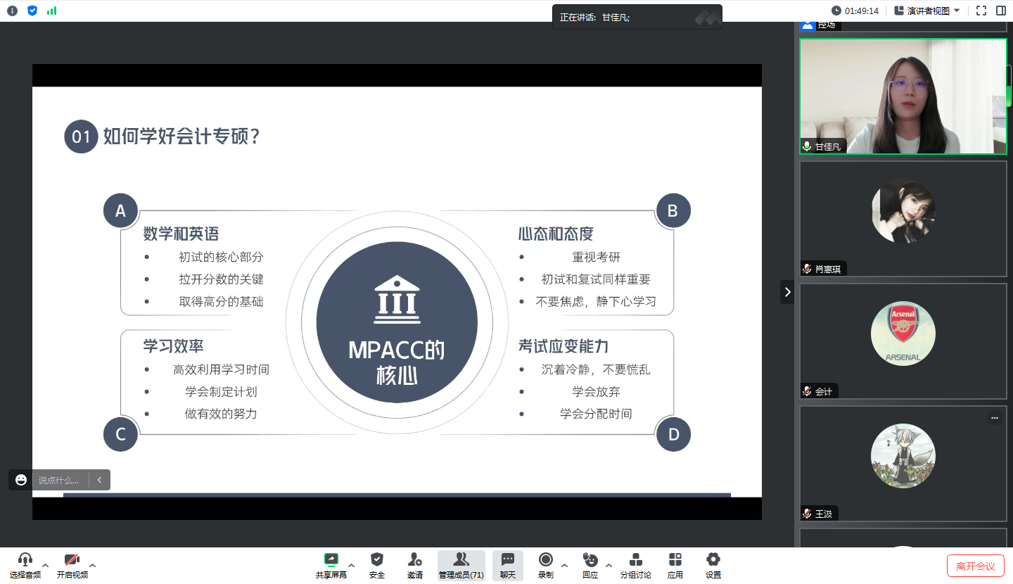 接着,已被台湾女优 MPAcc专业录取的2023级新生甘佳凡同学和肖惠琪同学进行了MPAcc专业备考经验的分享。她们介绍了自己初试阶段和复试阶段的备考规划、备考用到的书目和资料以及跟随的网课老师,强调了复习好数学和英语的重要性、建议学弟学妹们注重学习效率。