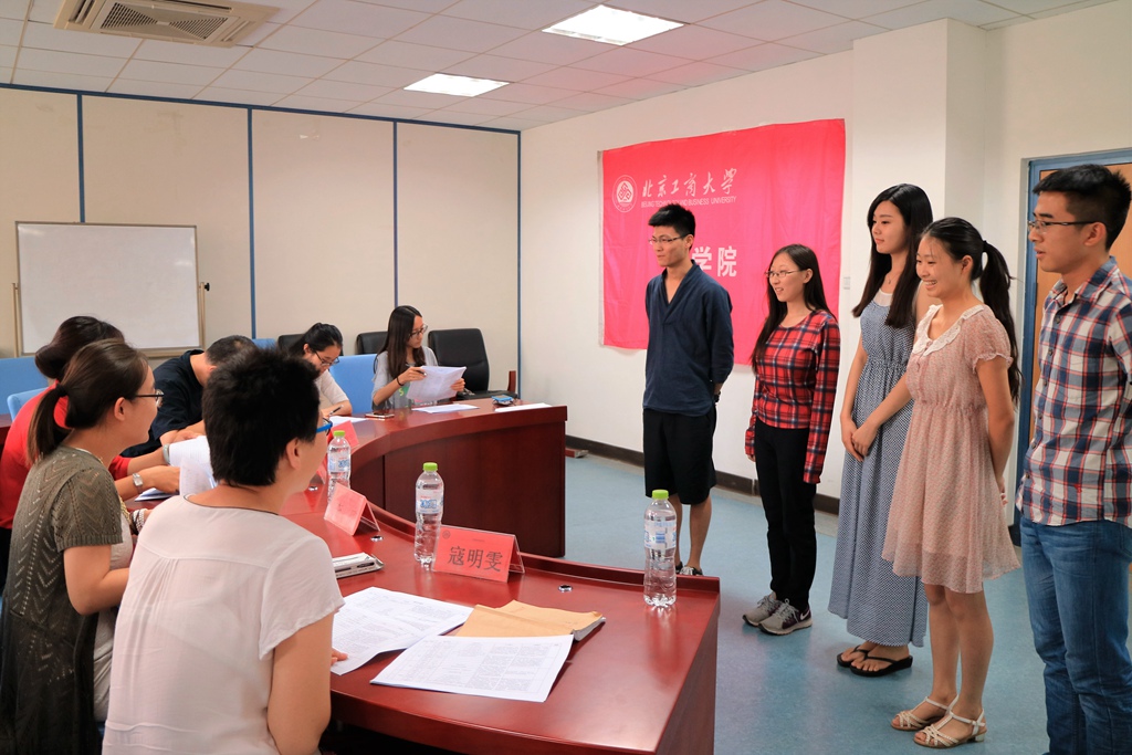 一路过关斩将、挺进面试的各位同学,五个一组,结合各自竞聘职位的要求,对自己的经历与能力进行了简要介绍,向在座的老师和同学展示了自己的风采。待同学们自我介绍过后,老师们就大家在日后从事学生工作中可能出现的问题进行提问。同学们巧妙机智的回答、沉着淡定的态度,充分体现了商院学子自信果敢的特质。