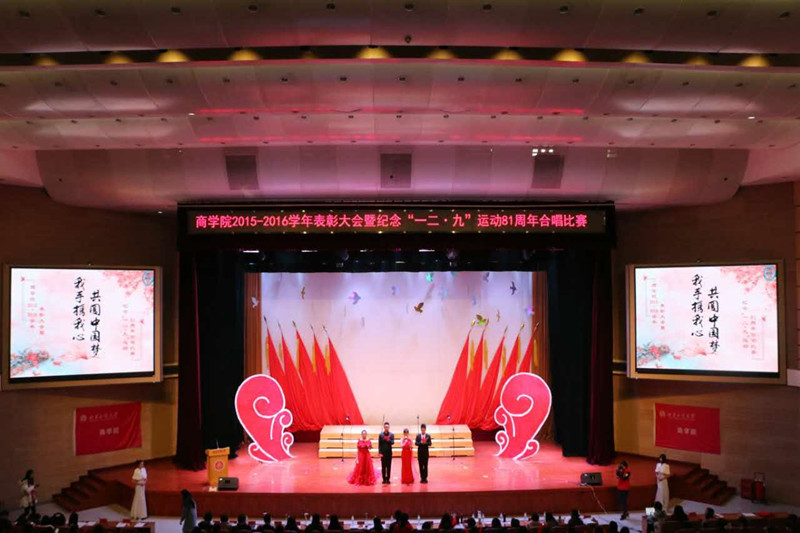 表彰大会之后是纪念“一二•九”运动81周年“我手携我心,共圆中国梦”合唱比赛,本次比赛共分为峥嵘岁月、青春年华、鹏程万里三个篇章。比赛中,2016级15个新生班级轮番登场,曲目中既有《游击队歌》《歌唱祖国》等红色经典,也有《倔强》《青春纪念册》等青春独白,亦有《仰望天空》《我的未来不是梦》等未来憧憬。在同学们的生动演绎下,观众仿佛可以看到八十多年前中国青年的奋力抗争,为中华之崛起而付出一切;又能得见如今中国如巨龙腾飞,雄踞于世,吾辈热血一如当年,爱国精神从不泯灭;还展望了未来,民族复兴任重道远,肩上责任代代相传,砥砺前行,中国梦必将实现!