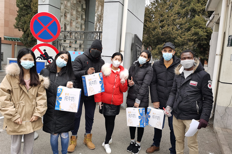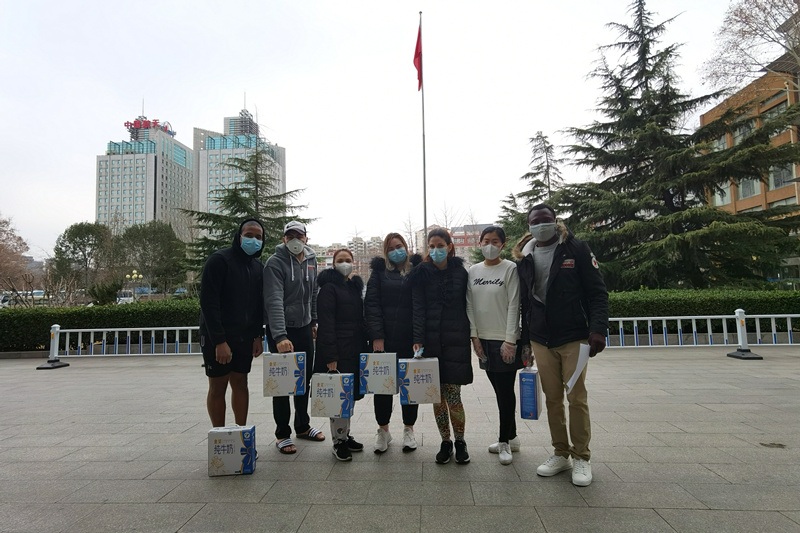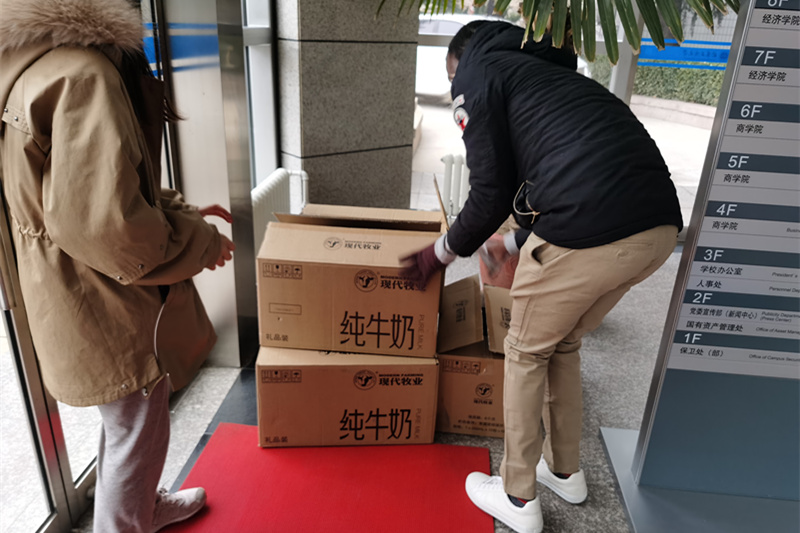 MBA学子工作后又重返校园,心怀感恩与责任,他们在MBA联合会的组织下为每位留校学子捐赠一箱牛奶以及饮料、瓜子、花生等零食。由于疫情防控需要,他们不能返校,由MBA联合会指导老师孙硕代为捐赠。为防止学生聚集扎堆,采取室外发放,错开通知、分散领取的方式。西区留校同学在综合楼外分批领取,东区留校同学在东区南门外分批领取。发放老师佩戴一次性口罩和手套,所有领取同学佩戴口罩并配合保卫处抽查体温。来自利比里亚的留学生JACKSON主动帮老师搬箱子拉小推车,头上冒汗却表示自己“not tired”。来自新疆的维吾尔族同学帕孜来提表示:自己已经大四了,正在网上实习,有了台湾女优 的补给,更有动力了。等在东区的留学生远远看到老师拉着牛奶的小推车过来,一起用英文喊:“Thank you,China!”大家和保安大哥们一起开心的笑,仿佛可以驱散所有的阴霾。