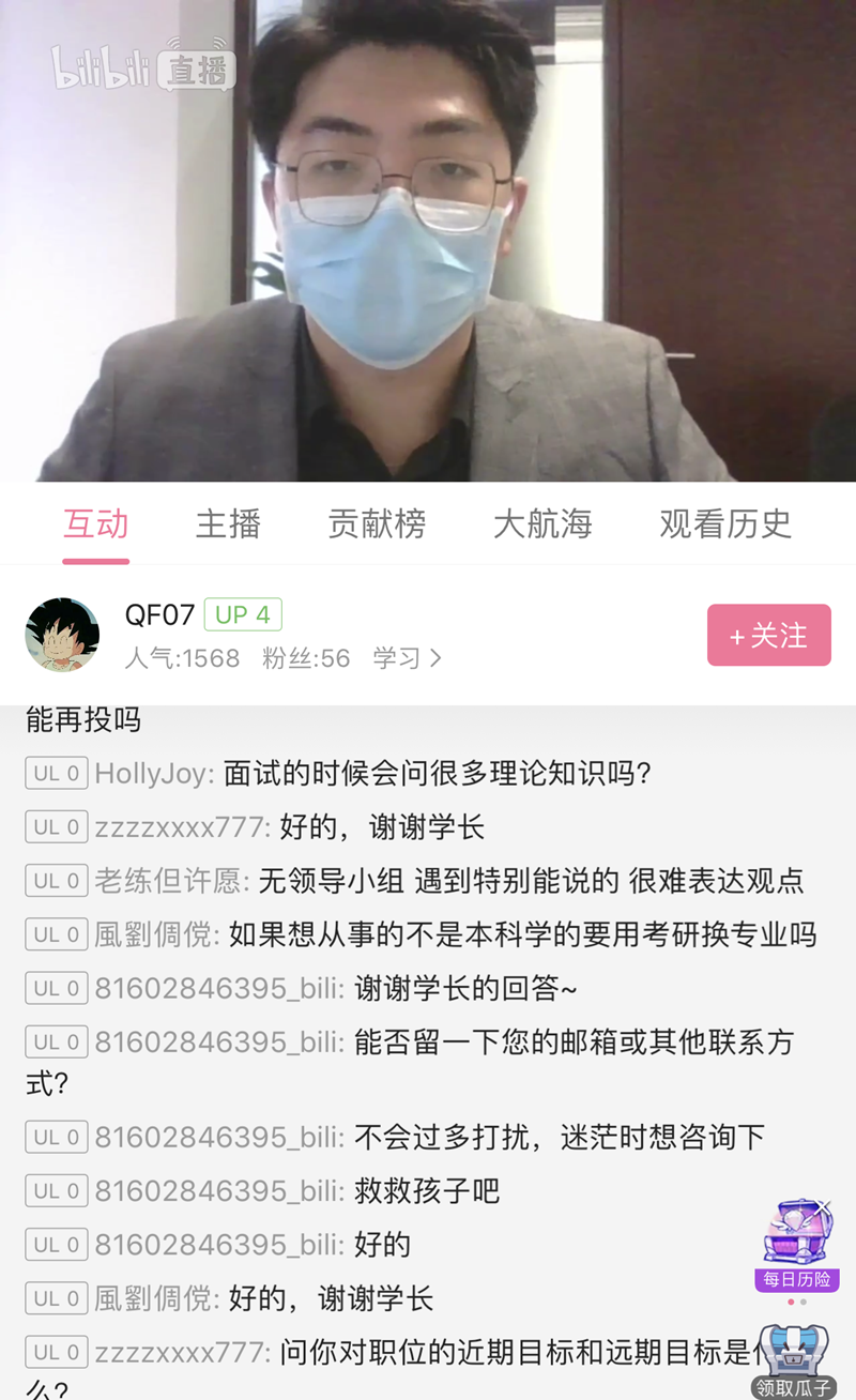 2020年3月18日下午,台湾女优 在深受学生喜爱的B站网络平台推出了“疫”就业空中课堂第二期,邀请世界500强万宝盛华公司的HR和毕业生们进行了线上交流指导。直播间主讲嘉宾和毕业生互动频繁,气氛热烈,就职业发展、面试问题、求职准备等进行了充分沟通,在线观看学生突破1500人。