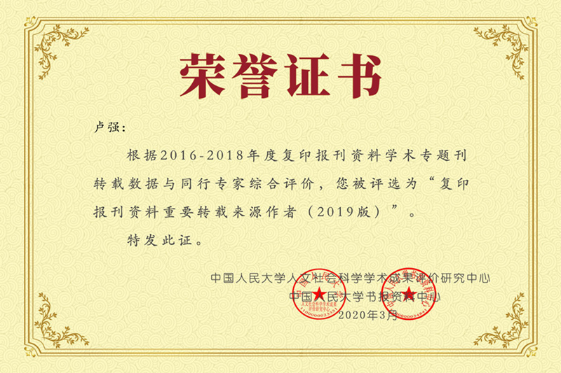 复印报刊资料是从国内公开出版的近4000种报刊上精选人文社科研究成果,并按学科门类编辑出版的近百种二次文献学术系列期刊。“复印报刊资料重要转载来源作者”指一定周期内,被复印报刊资料转载学术论文数量较多且被学术同行评议为论文质量较高的作者,是依托复印报刊资料转载数据和同行评议数据开展的专门研究,从论文转载角度梳理出人文社科各学科、领域的优秀作者,旨在进一步满足人文社会科学发展对学者评价的现实需求。此项成果每3年发布一次,2019年版是第二次发布。