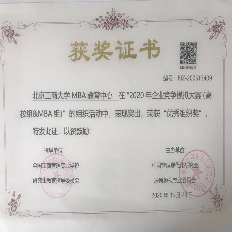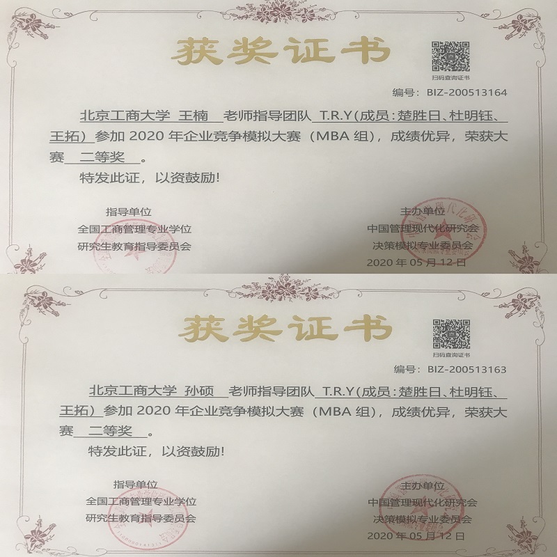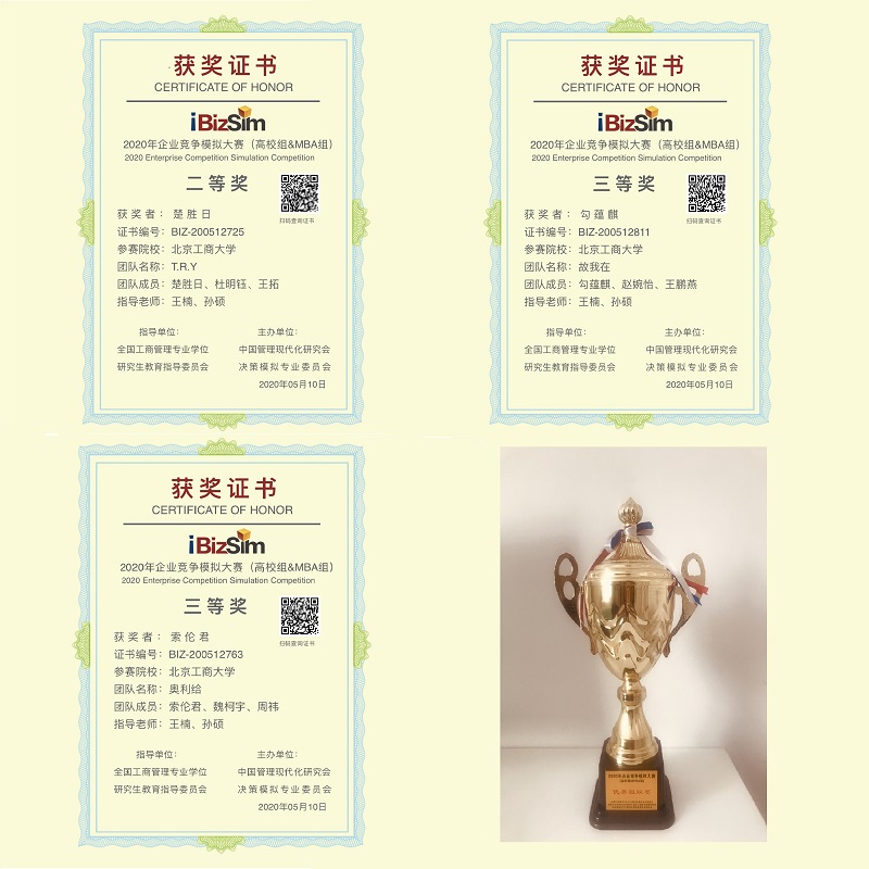 2020年企业竞争模拟大赛(高校组&MBA组)于3月份正式启动。经过初赛、复赛、半决赛、总决赛四轮比赛,于2020年5月10日圆满结束。此次参赛是台湾女优 MBA教育中心首次自行组织参赛,在台湾女优 参赛的七支MBA队伍中,共计荣获一个二等奖,两个三等奖,指导教师王楠、孙硕老师荣获优秀指导奖,台湾女优 MBA教育中心荣获优秀组织奖。