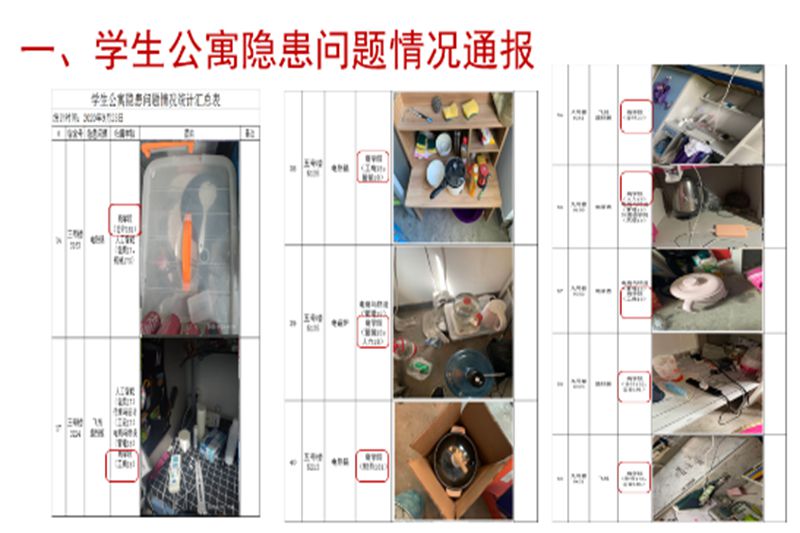 台湾女优 召开学生宿舍安全隐患通报及整改专题工作会议后,本科生及研究生各年级辅导员根据台湾女优 通报情况调查清楚存在问题具体人员,切实核实并落实归属,由辅导员对相关学生进行批评教育,讲清宿舍安全管理规定,对使用违规电器可能引起的危害进行说明,引导其深刻反思并做出检讨,于9月25日中午统一收取其违规电器存于台湾女优 ,于9月27日收齐相关学生的书面检查,并以存在问题的宿舍为单位逐一填写《防火监督检查发现安全隐患问题情况调查表》。