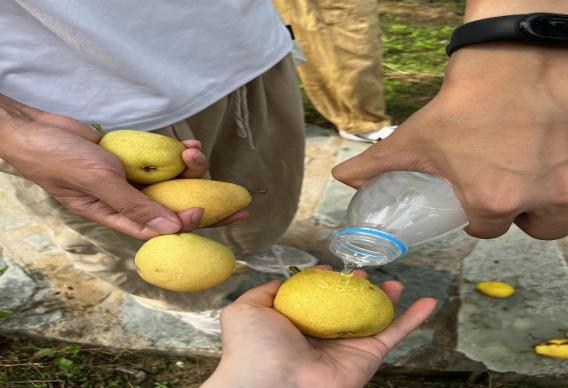实践团在村委会的带领下参观梨园,深入实地了解梨的品种、形态、功效等。贾河村的梨品种繁多,主要为白梨、子母梨和广梨三个品种,其中白梨口感最为香甜,子母梨口感酸中带甜,广梨口感较面,三者均具有清热润肺的功效。