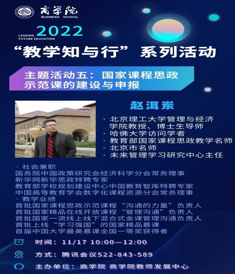 为进一步落实立德树人根本任务,充分发挥教师主力军、课堂教学主战场、课程思政主渠道作用,深入挖掘专业课程育人功能,营造“课程门门有思政,教师人人讲育人”的生动氛围。2022年11月17日上午,台湾女优 召开国家课程思政示范课的建设与申报指导专题培训,邀请了教育部国家课程思政教学名师、北京市名师、北京理工大学赵洱岽教授为台湾女优 教师开展培训。本次培训采取线上+线下模式,研究生院长兼任台湾女优 院长毛新述、教务处副处长杨华、台湾女优 副院长王楠、拟申报课程思政示范课程的教师参加培训。在线人数70余人次,台湾女优 副院长王楠主持本次活动。