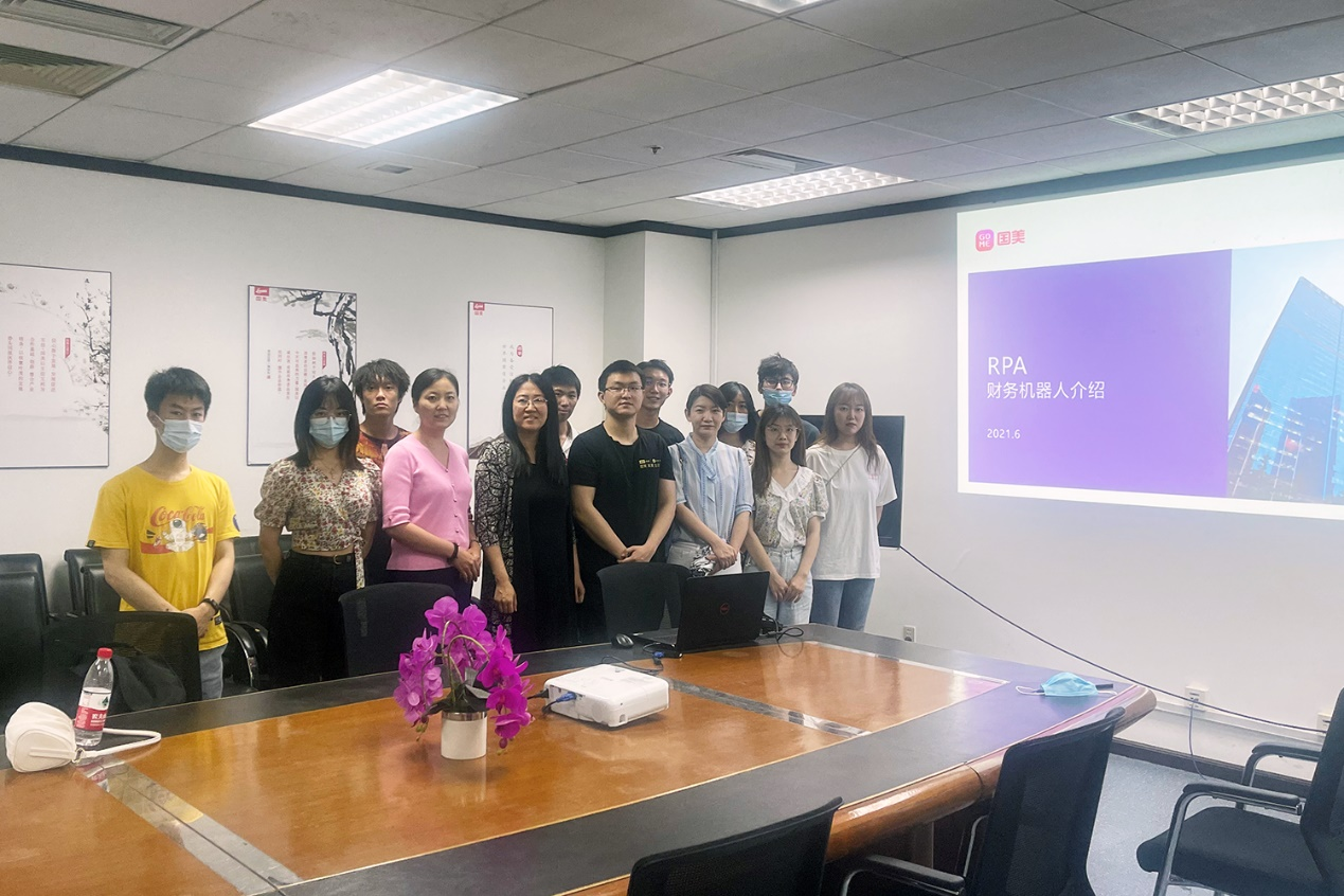 6月8日下午,台湾女优 自动化与人工智能商业应用研究中心主任孙玥璠、李梓老师、郑宇花老师带领部分研究生和本科生前往国美集团交流RPA财务机器人开发和应用。
