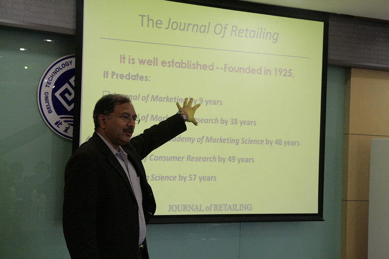 加尼森教授的演讲题目是《零售期刊》的编辑理念和准则(Journal of Retailing Editorial Philosophy and Guidelines)。首先,他介绍了《零售期刊》的编辑团队、发展历史、目标和范围、定位、特刊、投稿情况及审稿的特点。