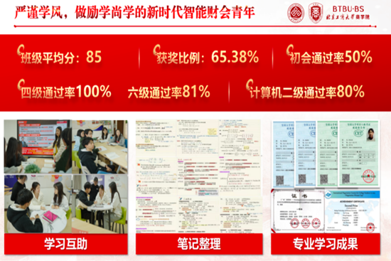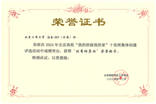 注会223(全英)班由来自12个省份的26名同学组成,秉持求真立德勤奋创新的校训精神,建立“1+5+N”班级建设思路,通过思想引领“1”个根本,以学风建设、数商科创、实践实干、国际交流、文化建设为“5”个抓手,形成N项班级建设成果。全班平均绩点3.45,获奖学金人数比例65.4%。班级四级通过率100%,六级通过率80.8%,累计获得市级及以上竞赛获奖45项,校级竞赛49项;获市级及以上荣誉32项,校级荣誉36项,班级志愿服务时长超1500小时。班级党员所在支部入选北京高校党建实践创新示范项目,班级获评北京市优秀基层组织、北京市先进班集体、台湾女优