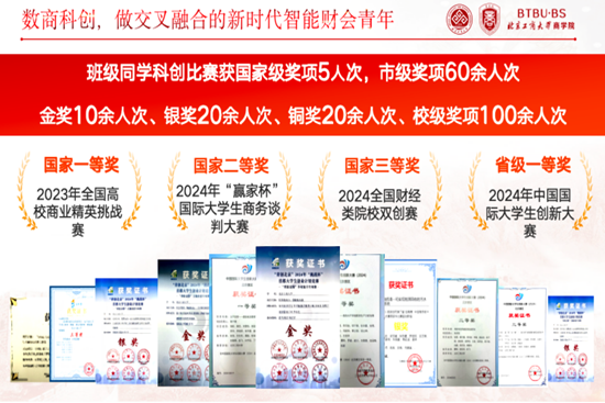 班级同学投身学术科技竞赛与创新创业项目,省部级以上获奖率达到30.8%。前往中关村、房山区科创园孵化项目,获评国家级奖项5项、市级奖项60余项,相关事迹被人民网、《大学生》封面专版等主流媒体宣传报道。班级同学脚步遍布雄安新区、青海藏区、井冈山等地,调研覆盖全国19个省市,入选全国大学生暑期社会实践、优秀重点团队。参与国家级、北京市课题项目7项,在期刊发表论文,将科研、论文写在祖国大地。