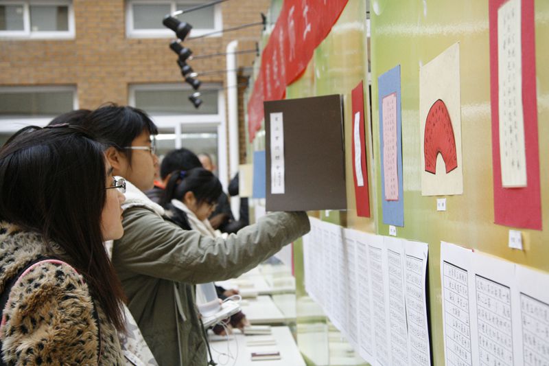 各位来宾共同为开幕式进行了剪彩。魏晓寰老师向图书馆赠送了自己的作品集等图书。同学们认真观看了魏晓寰学生的书法及篆刻作品,并和魏晓寰老师进行了交流。展览上还展出了部分魏晓寰老师书法及篆刻作品。展览近期将分别在阜成路校区和良乡校区图书馆举办。