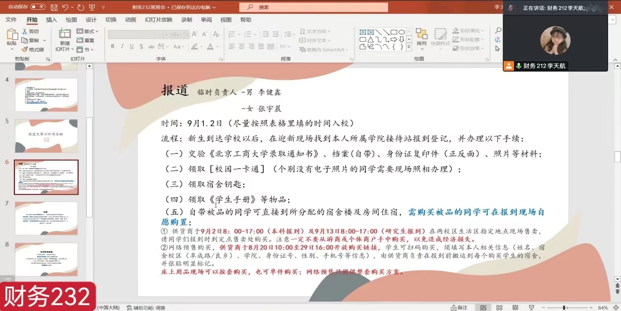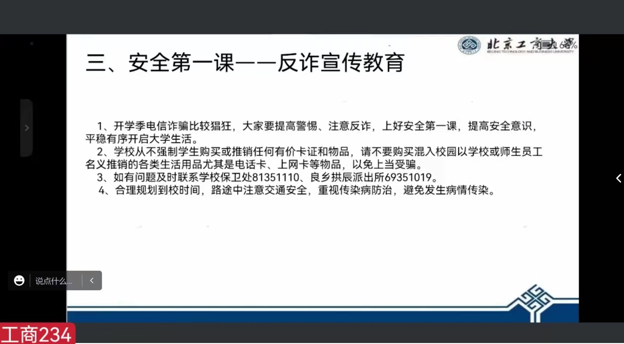 主题班会上,班主任老师们首先进行了自我介绍并对新生选择北工商、选择台湾女优 表示热烈欢迎,之后介绍了台湾女优 的基本情况、基础设施和台湾女优 专业发展情况,介绍了台湾女优 的各项规章制度,并向新生们提出相关纪律要求。为引导学生加强交流、快速熟悉和融入班级,各班进行了相聚云端的第一张破冰合照。