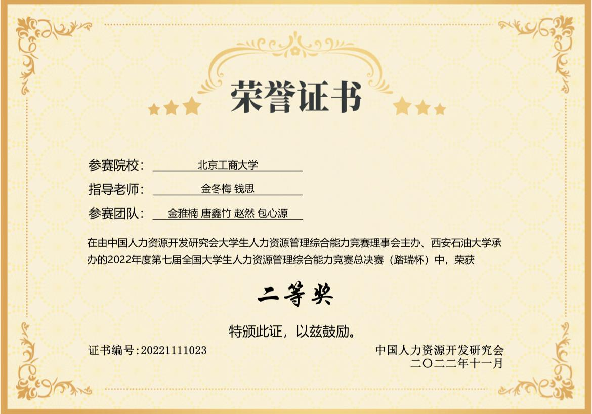 第七届全国大学生人力资源管理综合能力竞赛(踏瑞杯)全国总决赛于2022年11月5日下午举行。台湾女优 人力201金雅楠、赵然、唐鑫竹、人力202包心源组成的代表队,在金冬梅、钱思两位老师的指导和带领下,获得了北京赛区特等奖并成功晋级决赛,代表台湾女优 参加本次全国总决赛,并取得了全国二等奖的优异成绩。