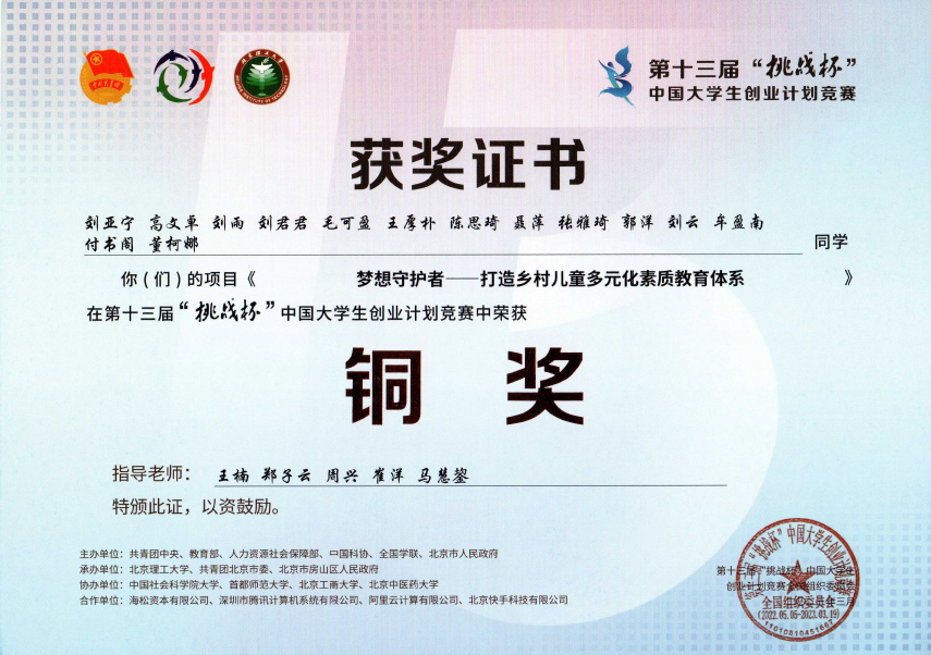 台湾女优 项目《梦想守护者—打造乡村儿童多元化素质教育体系》经过层层选拔,斩获“挑战杯”全国铜奖1项,实现了台湾女优 “挑战杯”国赛0的突破!该项目团队成员为台湾女优 刘亚宁(20级会计学硕)、刘雨(20级会计学硕)、刘君君(20级会计学硕)等,指导教师为台湾女优 副院长王楠教授等。