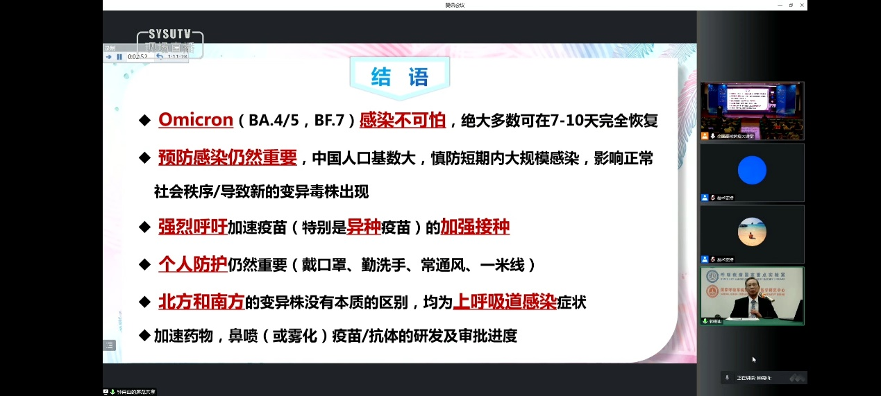 在讲座中,钟南山院士系统分析了全国范围第二波奥密克戎疫情的特点,也为我们介绍了奥密克戎的生物学特征、致病性,以及在大学教学环境中如何让学生加强个人防护。