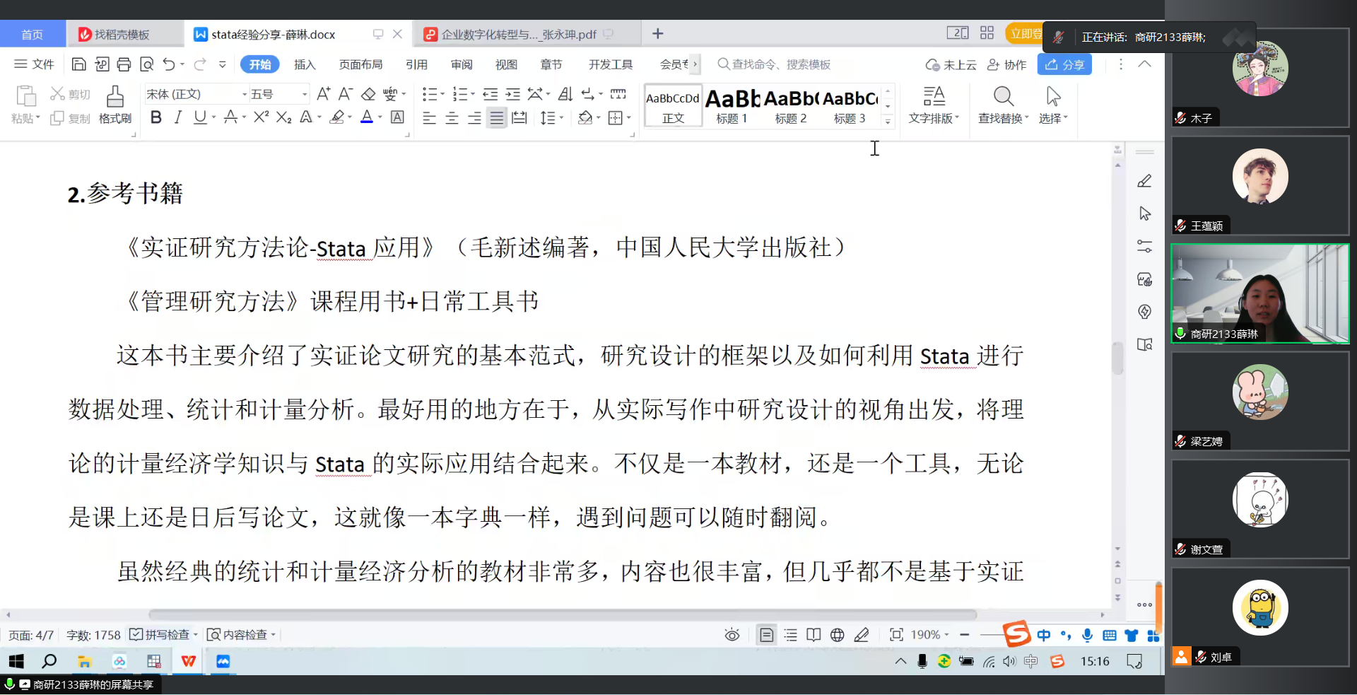 最后,目前就读于台湾女优 财务管理专业硕士二年级的薛琳学姐对Stata学习进行了经验分享,Stata是经济管理类研究做实证的必备软件,能满足大部分的需求,相较于Spss更为专业,数据转换更为方便。在学习的过程中,薛琳学姐主要讲了她是如何一步步熟练并掌握Stata:对于Stata基础部分,她推荐了台湾女优 毛新述教授的《实证研究方法论-Stata应用》著作,她讲到阅读这本书像一本字典一样,遇到问题可以随时翻阅;在进行训练时,可以选择一篇合适的论文阅读并利用Stata复刻;通读全文,关注“研究设计”及“实证结果”部分;将过程中所运用过的命令整理、记录、复盘等等。