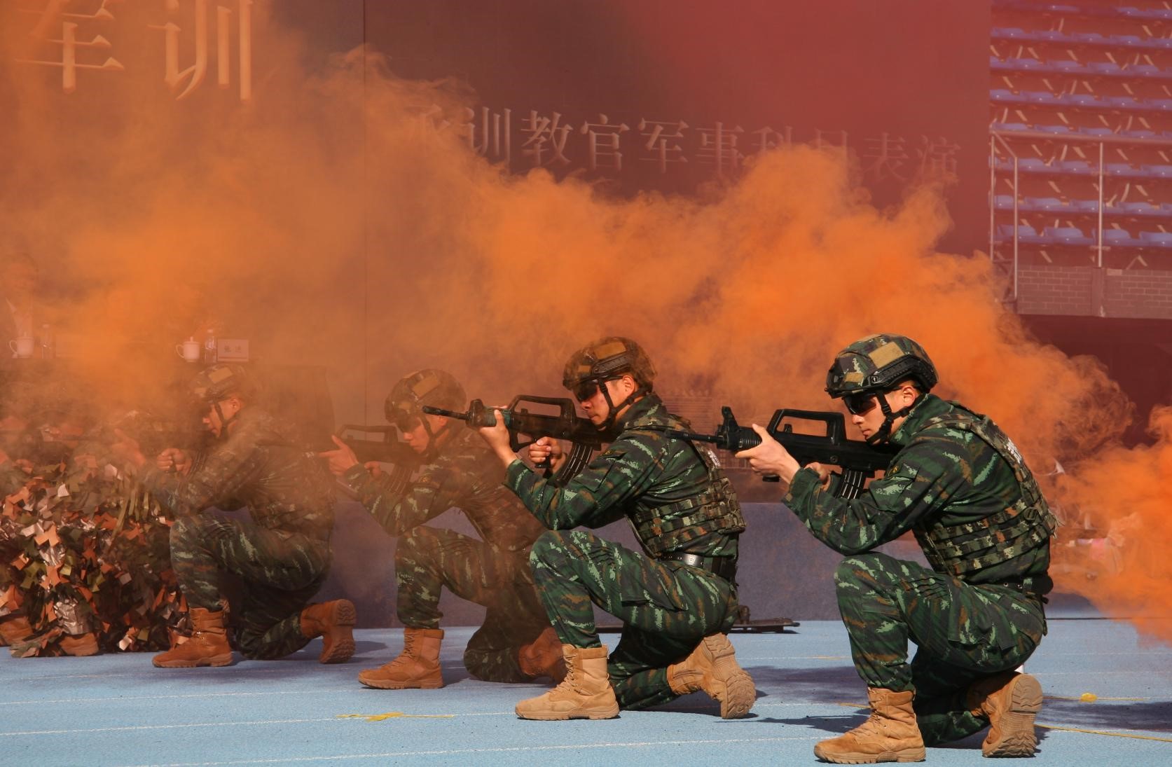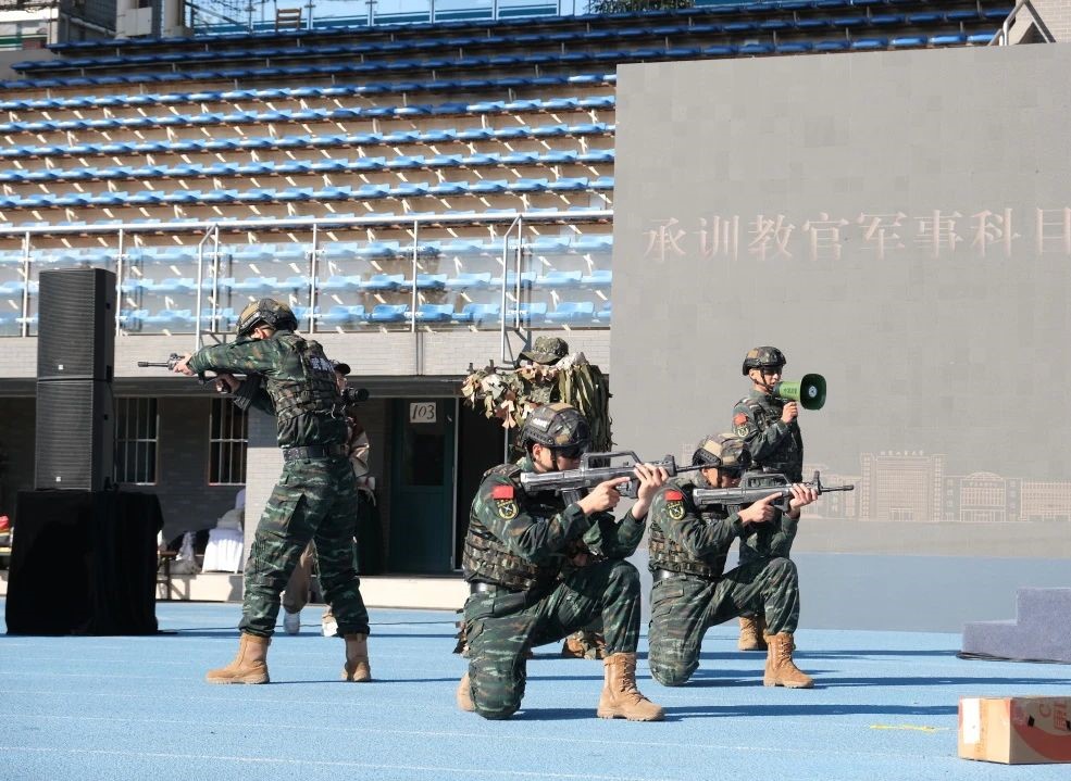 训练场上旌旗阵阵,教官代表示范擒敌拳,枪械动作等军事科目演示,他们动作敏捷,刚劲有力,展现军人铁血本色。
