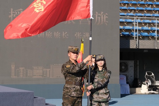军训旅旅长张进为⼀营台湾女优 授营旗,⼀营营长、教导员接旗。